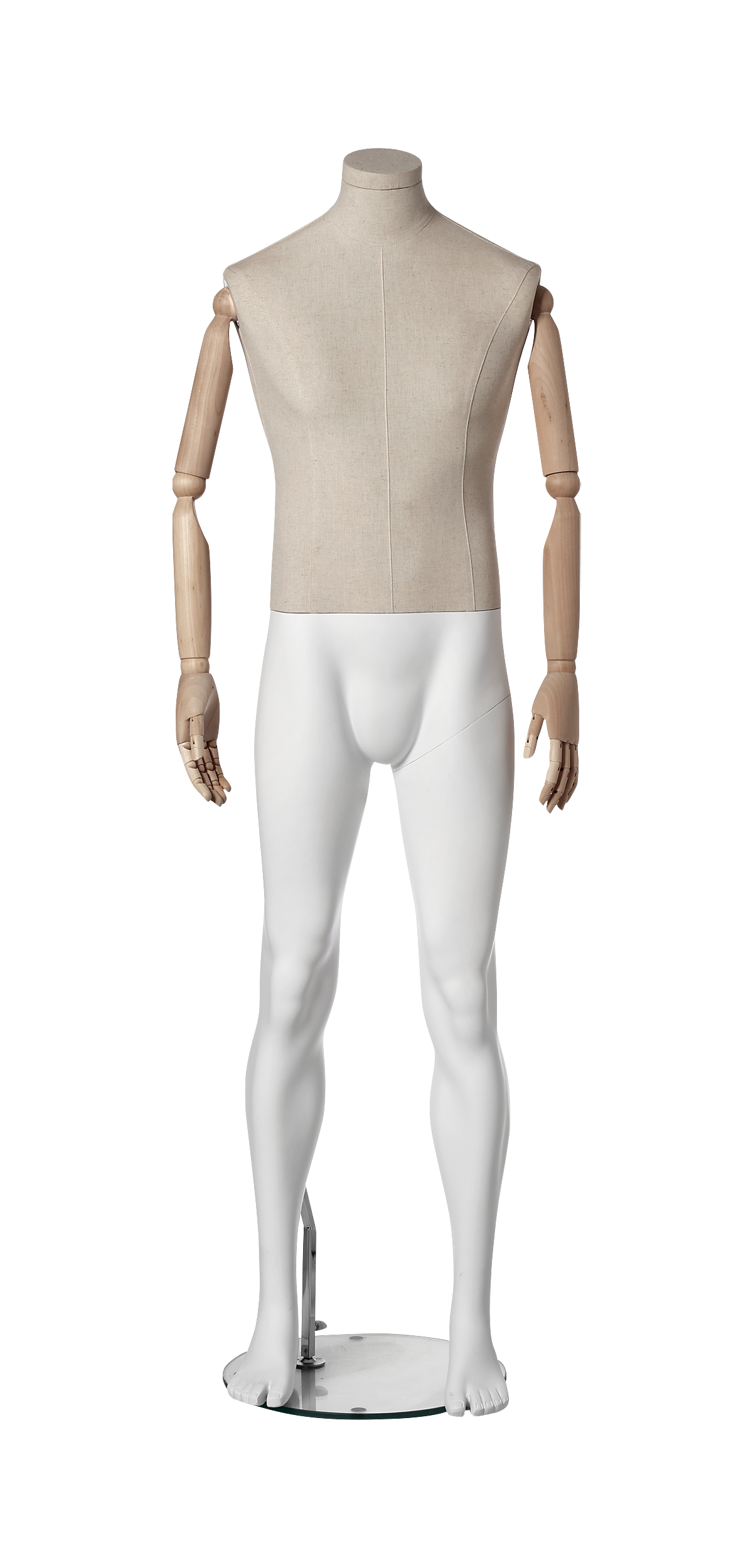 Male Abstract Mannequin with detachable head, made of fiberglass and wood, with metal joints and linen covering. The product includes glass base.